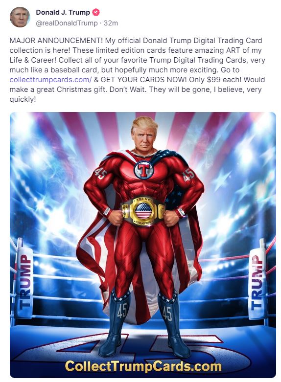 또한 15일(현지시간) 더블록에 따르면, 비트코인은 ‘스캠’이라며 암호화폐에 부정적 발언을 지속해온 도널드 트럼프 전 美 대통령이 트루스 소셜 계정을 통해 자신의 ‘NFT 트레이딩 카드’ 컬렉션을 공개했다.