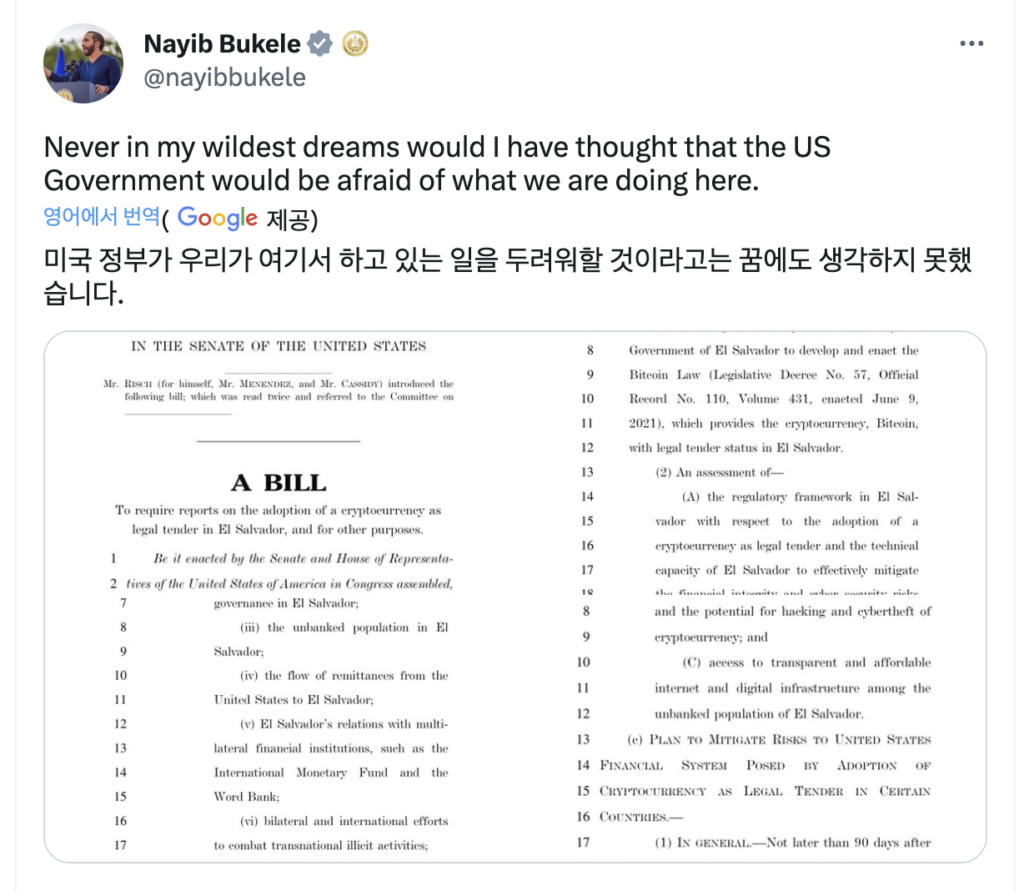 이날 전해진 의회 기록에서는 아이다호 주의 상원의원 제임스 리슈와 뉴저지 주의 상원의원 밥 메넨데즈는 지난 11일(현지시간) “엘살바도르에서 암호화폐 채택에 대한 보고를 요구하는 법안”을 도입했다. 이는 엘살바도르의 비트코인 법이 발효된 지 불과 몇 달 만인 2022년 2월 리슈 의원이 발의했던 ‘암호화폐에 대한 설명 책임법’을 도입하기 위한 두 번째 시도이다.