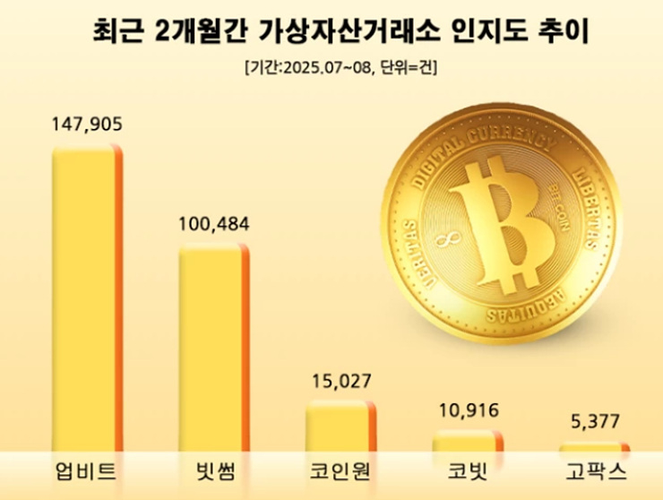 최근 2개월간 국내 가상자산거래소 중 업비트가 가장 높은 브랜드 인지도를 기록했다는 조사 결과가 나왔다.