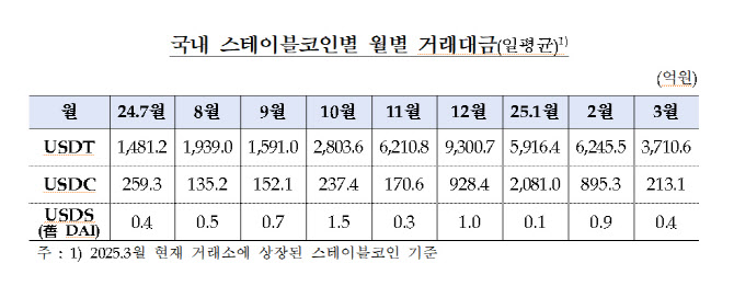 5대 거래소의 스테이블코인 거래 규모는 지난해 3·4분기 17조598억원에서 4·4분기 60조2902억원으로 3배 넘게 늘어난 뒤 올해 1·4분기까지 비슷한 수준을 유지했다.