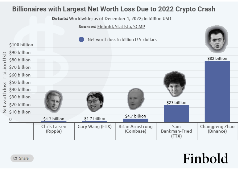 핀볼드에 따르면 “올해 자오창펑 CEO의 순자산 감소액은 820억 달러 수준으로 파악됐다. 그의 순자산은 현재 146억 달러이며, 지난해 965억 달러 대비 크게 줄었다”며, “그 다음으로는 FTX의 SBF 전 CEO로 조사됐다. 그는 체포되기 전 3주 동안 230억 달러를 잃었다”고 설명했다.