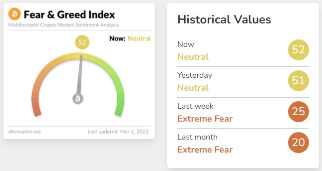 또한 어터너티브의 크립토 공포와 탐욕지수는 어제 51점으로 ‘중립’수준을 되찾은데 이어, 이날 52점으로 여전히 ‘중립’수준으로 유지하고 있다.