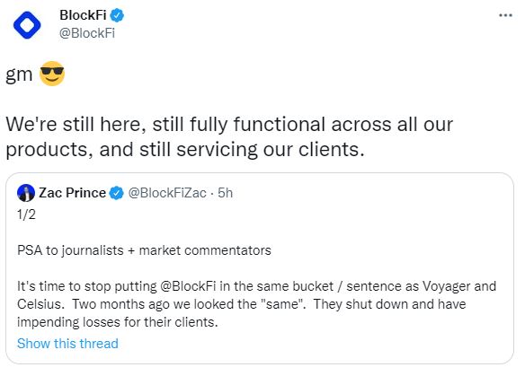 블록파이는 “보이저디지털과 셀시우스는 서비스를 중단했고, 고객은 손실을 눈앞에 두고 있다. 하지만 블록파이는 모든 상품(신용카드, 대출, 거래, 이자수익(earning interest))을 문제없이 제공하고 있으며 고객 손실 또한 없다”고 전했다.