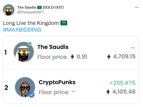 해당 컬렉션은 사우디아라비아를 테마로 5555개 NFT를 7월 9일 발행한 것으로, 최저 가격은 지난 9일 약 1.3 ETH으로 최고 수준을 기록한 후, 현재는 약 0.75 ETH를 기록하고 있다.