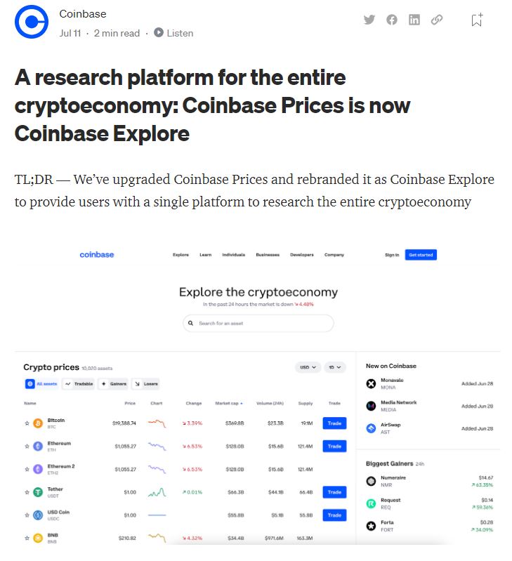 한편, 같은 날 암호화폐 거래소 코인베이스가 공식 블로그를 통해 암호화폐 경제를 위한 연구 플랫폼인 코인베이스 프라이스(Coinbase Price)가 코인베이스 익스플로러(Coinbase Explore)로 업그레이드 됐다고 밝혔다.